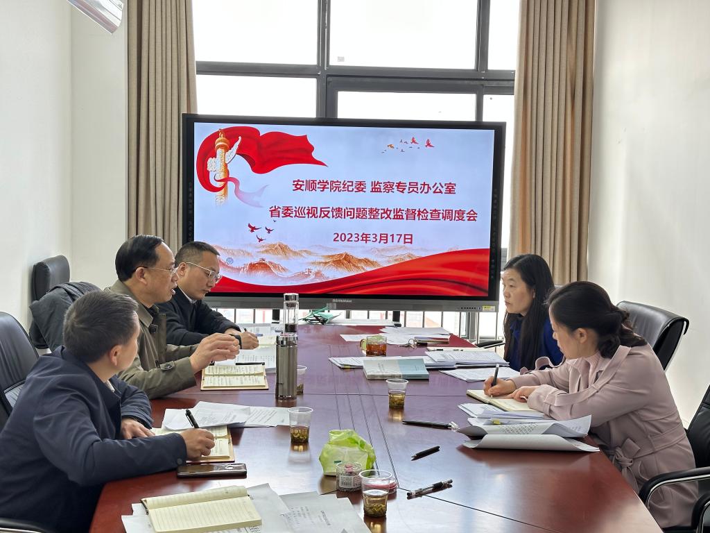 2023年3月17日下午,安顺学院召开省委巡视反馈问题整改监督检查调度会,对巡视整改监督检查工作情况进行调度。安顺学院党委委员、纪委书记蔡红英主持会议,巡视整改监督检查工作领导小组成员参加会议。