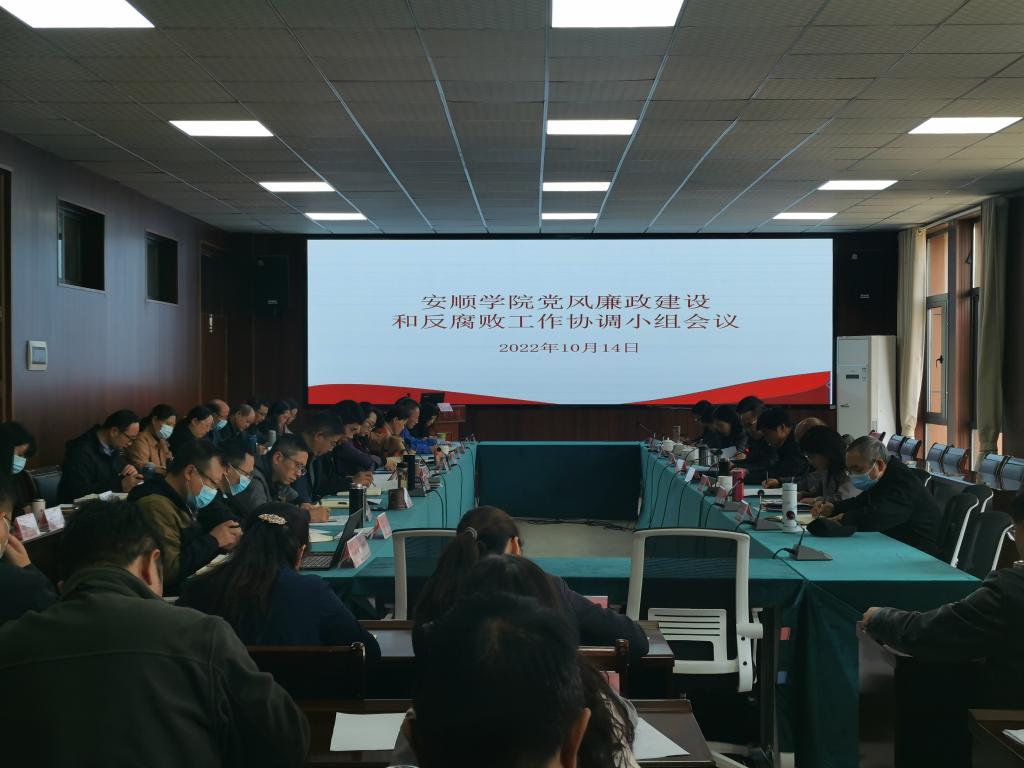 2022年10月14日,安顺学院党风廉政建设和反腐败工作协调小组会议在安道楼五楼第一会议室召开,会议主题为“规范项目招投标工作,切实防范廉洁风险”。安顺学院党委书记罗荣彬,党委副书记、校长陈云坤,党委副书记陶文彩和有关校领导出席会议,协调小组各成员部门、各二级单位负责同志参会。会议由陈云坤主持。