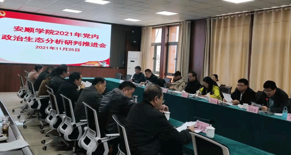 2021年11月25日下午,安顺学院党内政治生态分析研判推进会在学校安道楼第一会议室召开,会议的主要任务是学习贯彻十九届六中全会精神,学习《中共贵州省委办公厅关于全省党内法规执行情况专项监督检查的通报》。对前期学校政治生态分析研判情况进行系统梳理、总结盘点,深入分析工作中存在的差距和不足,对下步工作进行部署安排。安顺学院党委书记罗荣彬出席会议并讲话,参加会议的有学校党内政治生态分析研判机制成员单位主要负责人和具体执笔人,学校计财处、基建处、国资处、人事处、工会、后勤处、学工部主要负责人。会议由安顺学院党委委员、纪委书记、监察专员蔡红英主持。