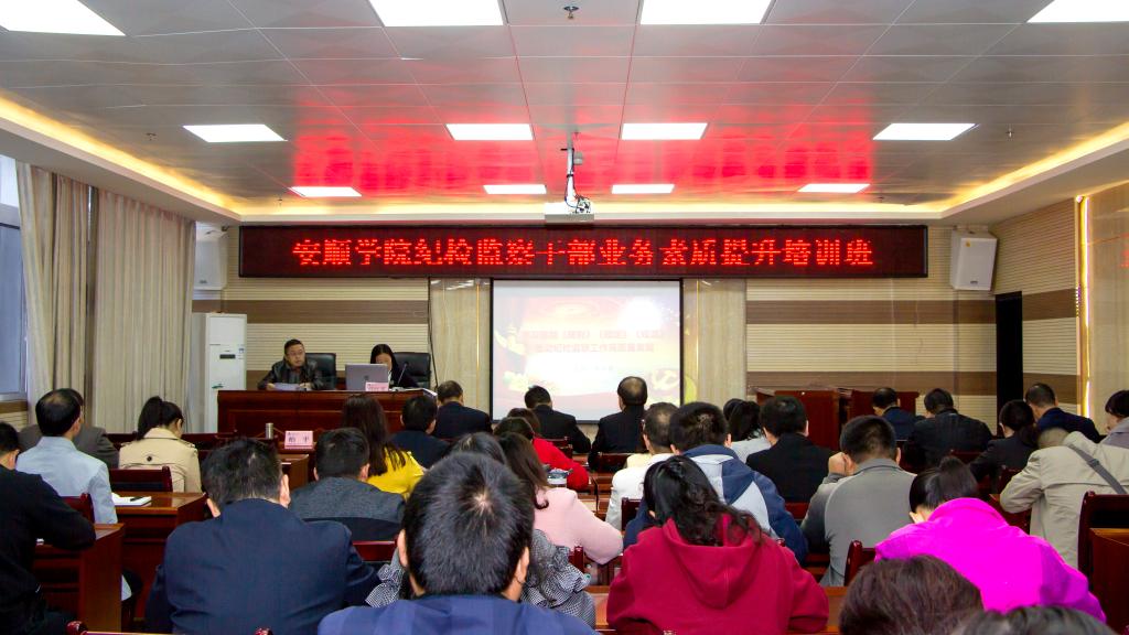 为深入推进纪检监察干部队伍建设年工作,贯彻落实“不忘初心 、 牢记使命”主题教育对纪检监察干部的要求,不断提高纪检监察干部的政治素质和业务能力。10月17日上午,安顺学院纪检监察干部业务素质提升培训在特教大楼七楼第三会议室举行。校党委委员、纪委书记、校监察专员蔡红英主讲。学校纪委委员、各二级党委纪检委员、各党支部纪检委员(分管纪检工作的同志)、校纪委校监察专员办公室全体干部参加培训。培训由校纪委副书记柏平同志主持。