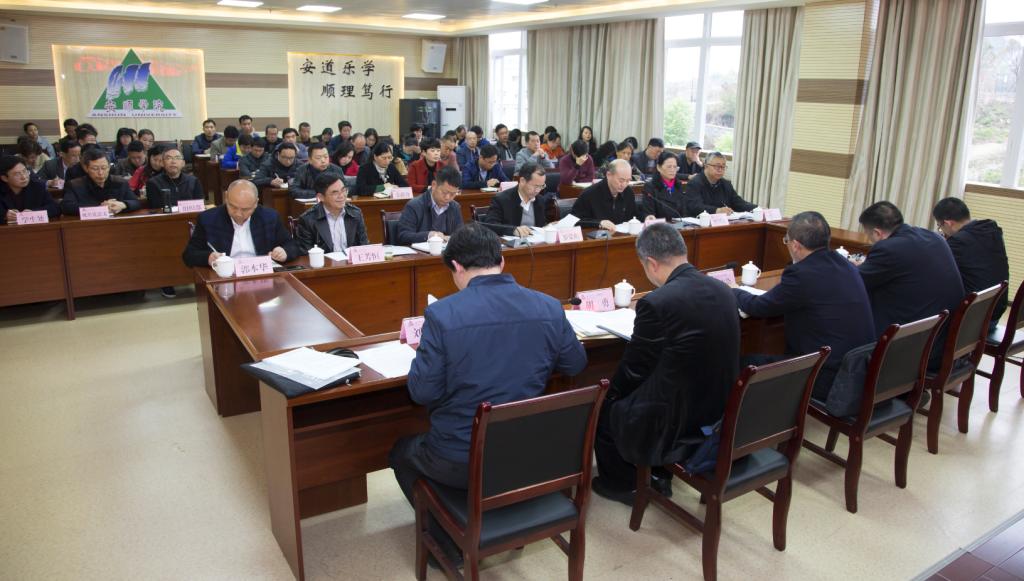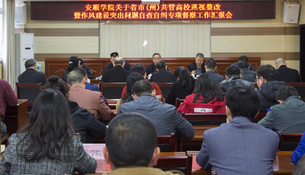 2018年3月26日,安顺学院召开省市(州)共管高校巡视整改暨作风建设突出问题自查自纠专项督察工作汇报会。由省教育厅党组成员、省委教育工委委员、省纪委派驻省教育厅纪检组长蒋志伦任组长,省教育厅审计处处长胡勇、省教育厅机关党委办副主任李杨波、省教育厅审计处主任科员刘俊杰、省教育厅机关党办张热为成员的省委教育工委巡视整改情况第三专项督察组到我校开展专项督察工作。安顺学院在家校领导、校属各学院(部门)主要负责人及教职工代表参加汇报会。汇报会由刘雷院长主持。