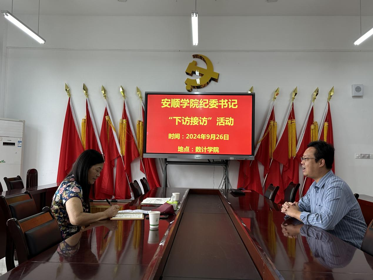 2024年9月26日,安顺学院党委委员、纪委书记、监察专员蔡红英到数学与计算机科学学院开展“下访接访”活动,并深入调研学院基层党建、意识形态、学科专业建设、师资队伍、审核评估、学生管理和服务等方面工作情况。活动中,蔡红英与师生进行了面对面交流,广泛收集了师生反映的问题,并将有关意见建议向学院负责人进行了反馈并提出工作要求。